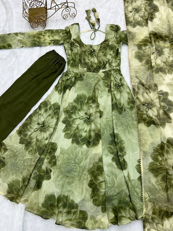 ✨ Add the Mehandi Organza Printed Anarkali Gown With Pant & Dupatta Set to your festive collection today!