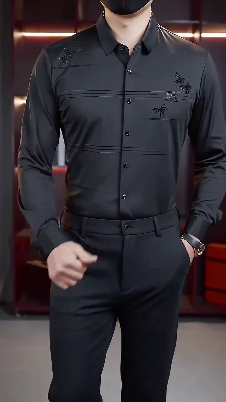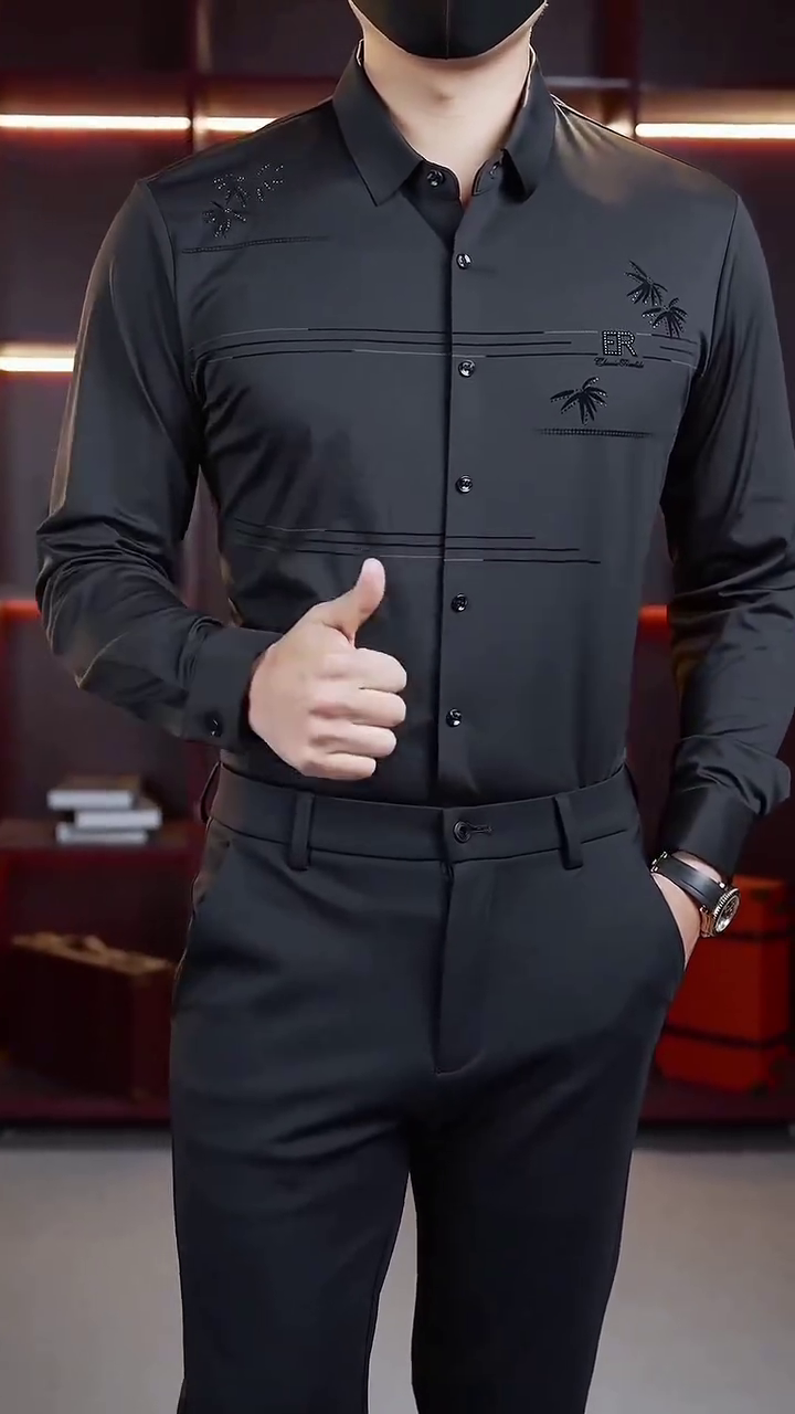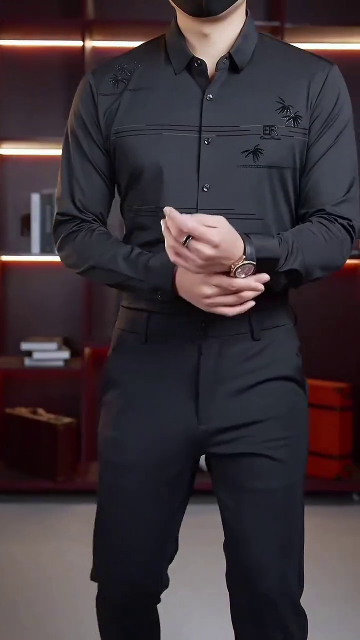 Step into effortless sophistication with this charcoal grey designer formal shirt, crafted for men who value elegance with a modern edge. The shirt features subtle horizontal line detailing complemented by refined embroidered motifs, adding a distinctive yet understated luxury appeal.