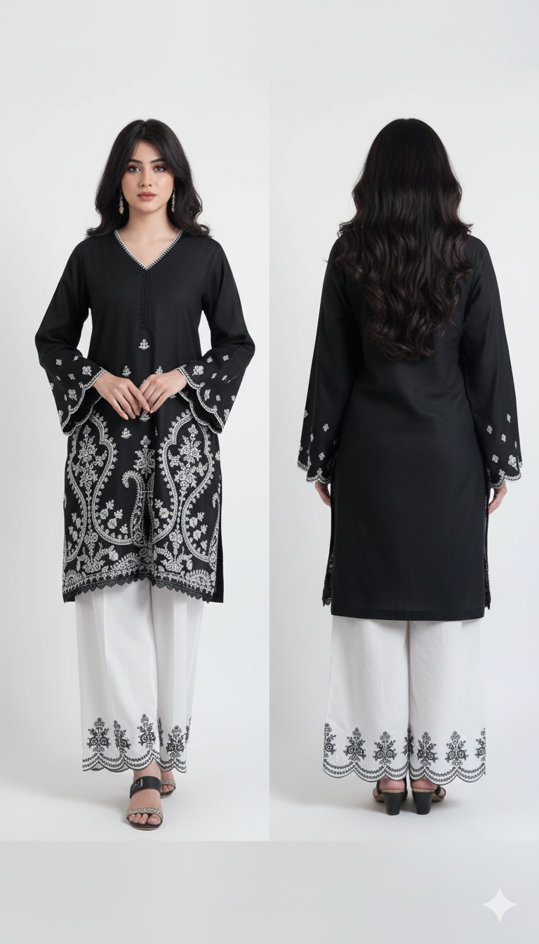 Crafted from premium viscose rayon, this kurta set combines soft texture, effortless draping, and intricate embroidery, giving you a look that is both timeless and fashion-forward. The full sleeves design, trending embroidery patterns, and classic black shade make it a versatile choice for modern women who appreciate Pakistani-inspired ethnic wear.