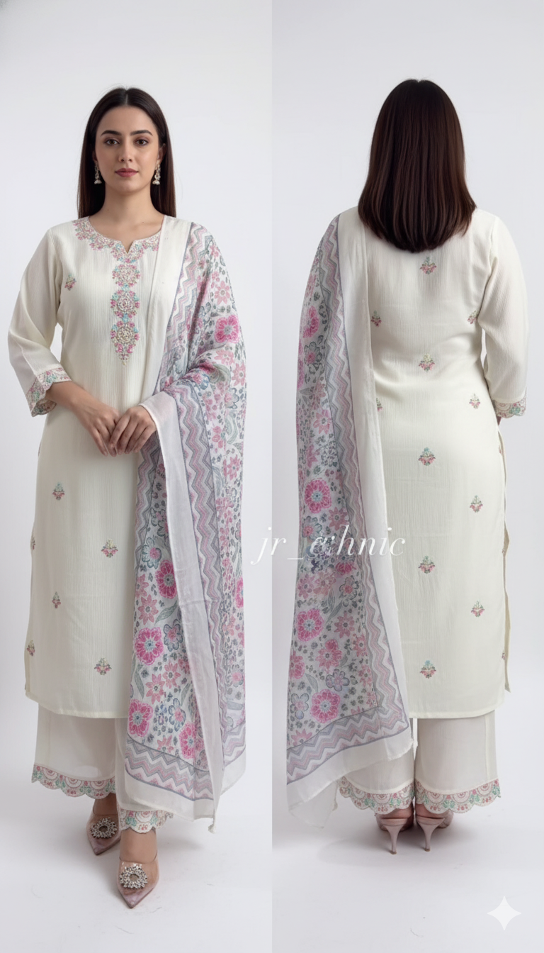 This set blends traditional Indian embroidery with modern style, making it a must-have for women who love ethnic wear with a contemporary twist.